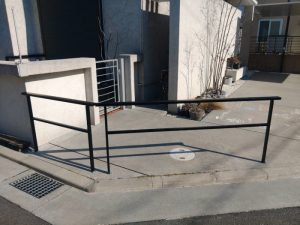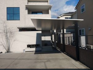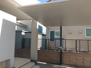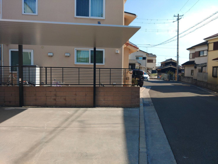 カーポート側面の既存境界ブロック上部に高さ80㎝のフェンスを設置し、カーポートの柱とフェンスのブラックカラーが空間を引き締め、隣地との境界を明確にしています。