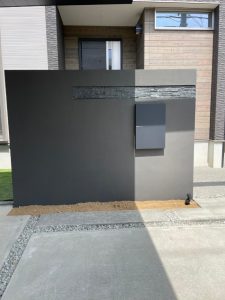 玄関ポーチ前には、目隠しを兼ねてお客様ご要望の幅も高さもある塗り壁門柱を設置しました。