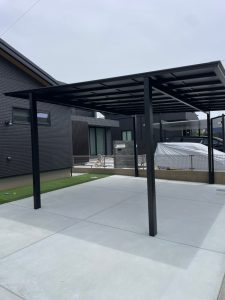 上部にはお車2台駐車可能なブラックカラーが印象的なフラットスタイルのカーポートを設置しました。