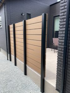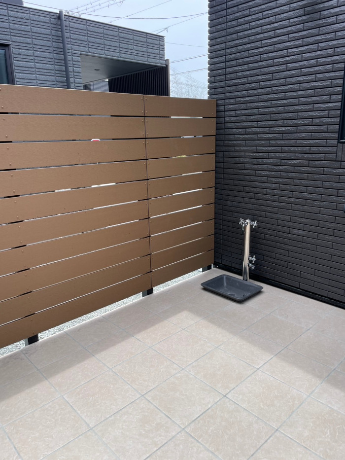 高さ2mの木目調の目隠しフェンスを設置し、テラスタイル上部の既存立水栓下にはガーデンパンを設置。