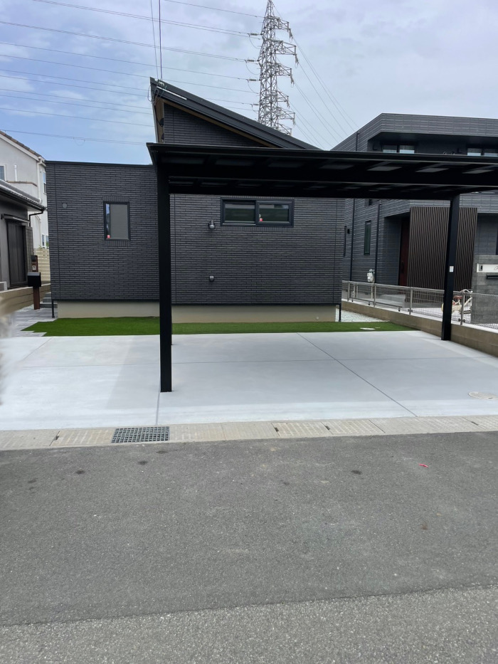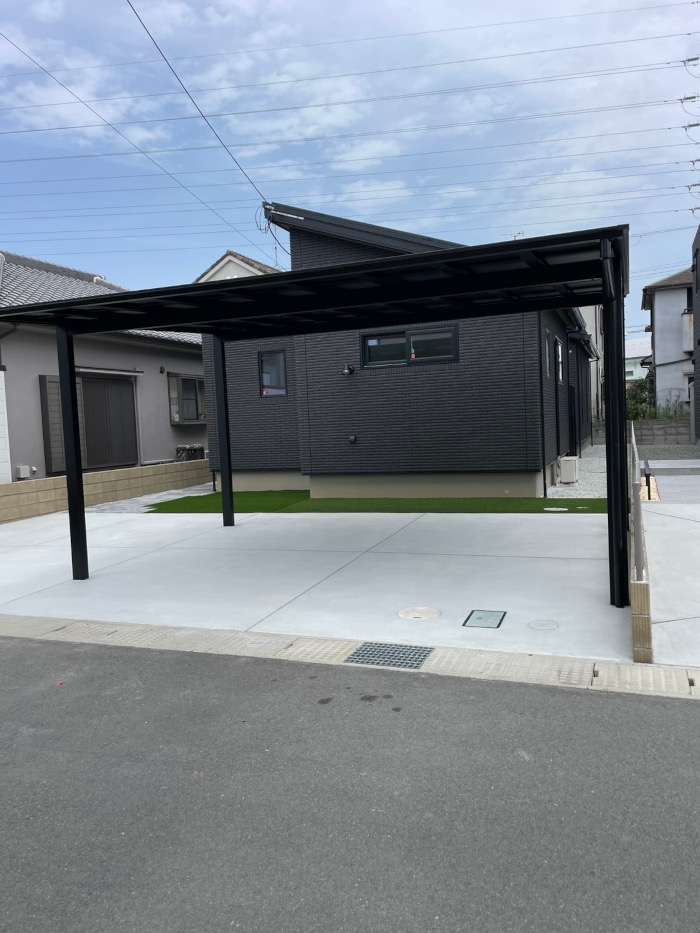 上部にはお車2台駐車可能なブラックカラーが印象的なフラットスタイルのカーポートを設置しました。