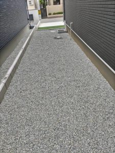 外周は、雑草対策として防草シートに砂利を敷設しています。