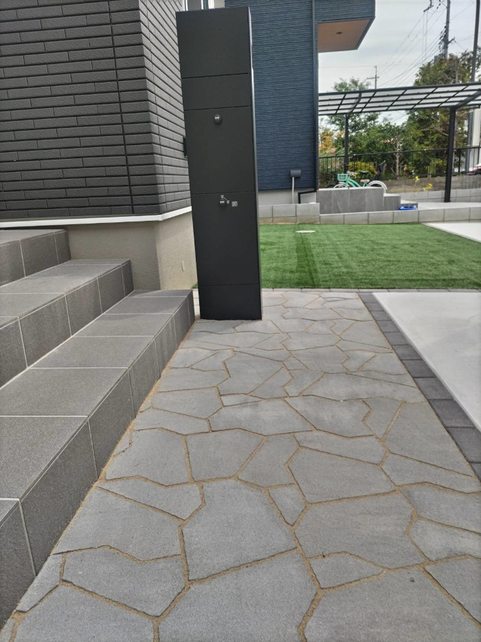 玄関ポーチ前は、外観のアクセントにもなるアプローチとして天然石風の乱形インターロッキング