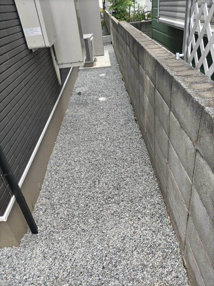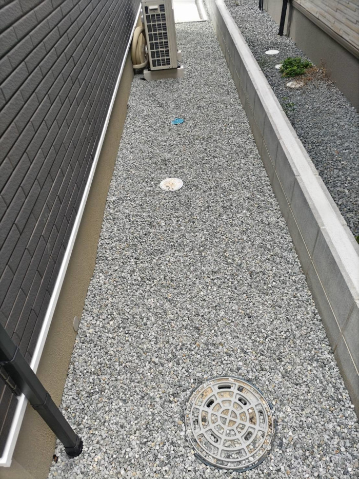 外周は、雑草対策として防草シートに砂利を敷設しています。